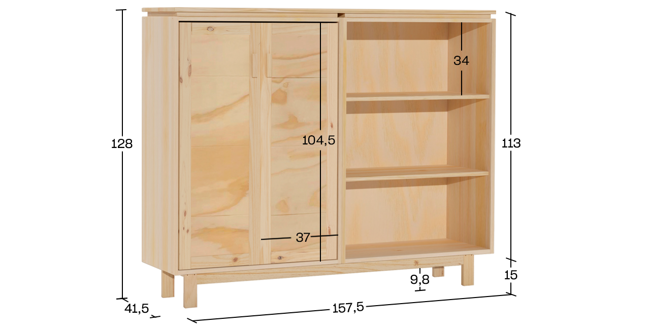 Aparador em madeira natural ecológica com espaço de arrumação fechado e estante aberta para livros e objetos decorativos. Uma peça que alia funcionalidade e design, pensada para se adaptar a diferentes espaços da casa. Fabricado em madeira ecológica, permite organizar e arrumar de forma eficiente.