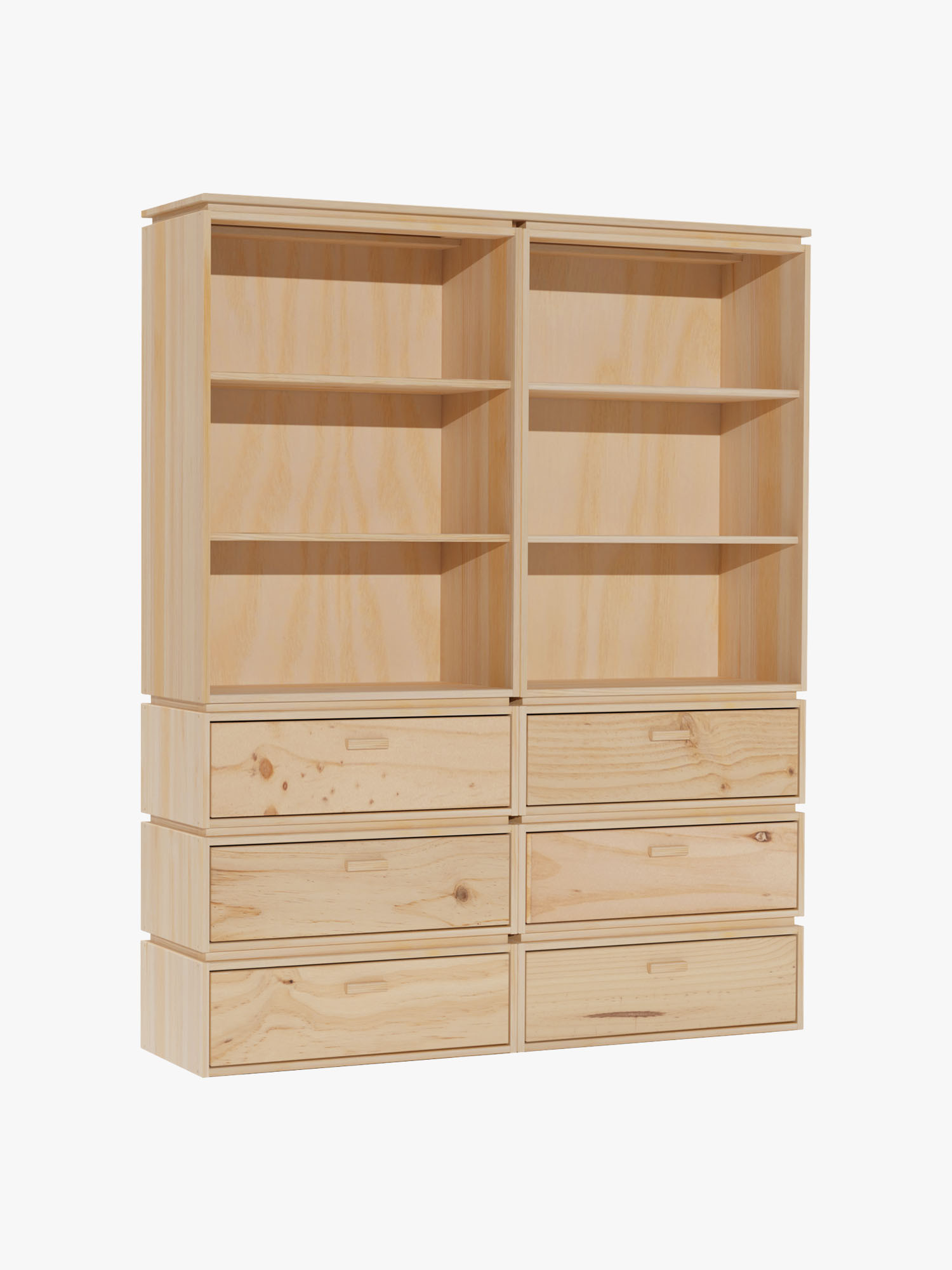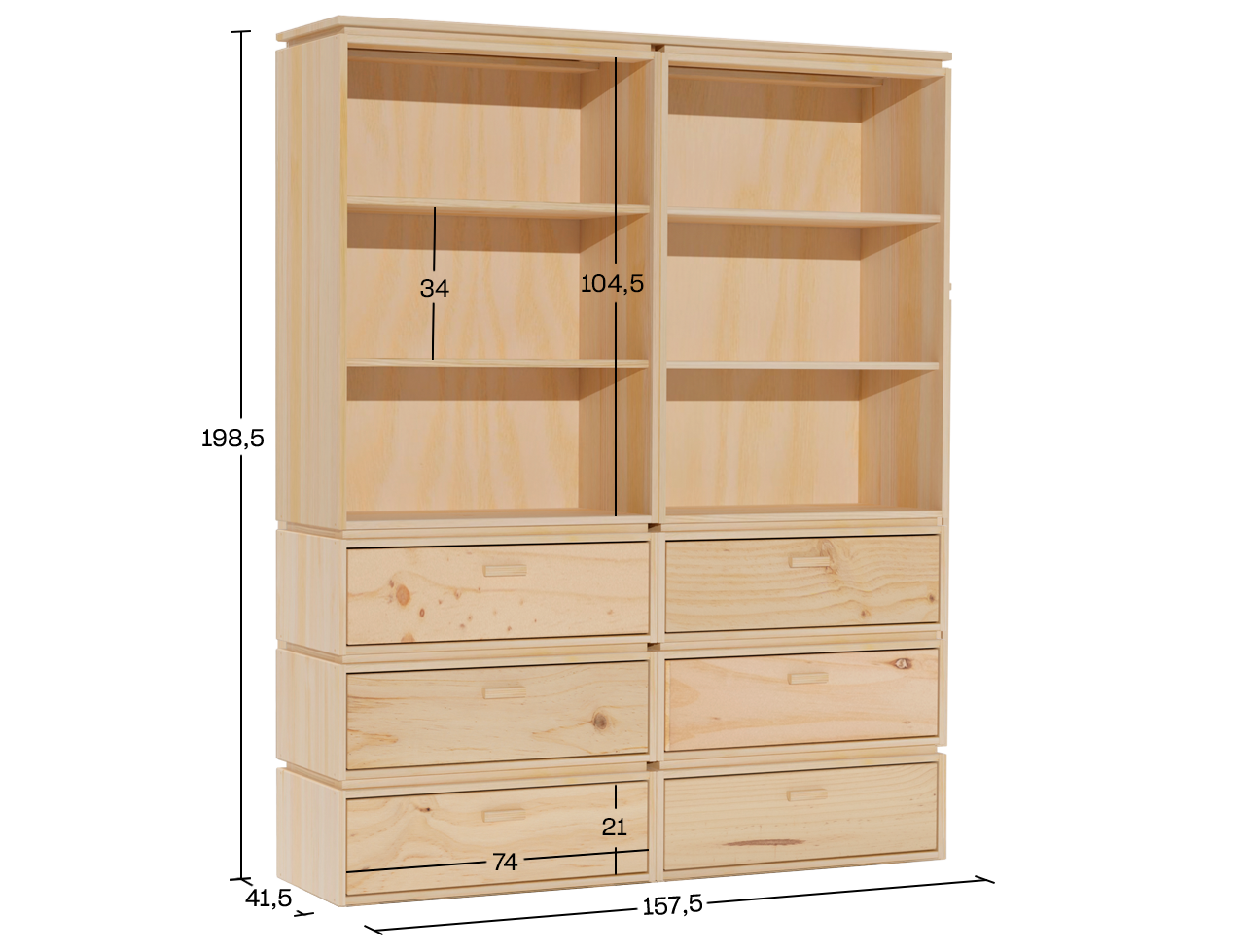 Estante dupla em madeira natural com seis amplas gavetas de arrumação para guardar livros, objetos decorativos, roupa, utensílios ou complementos. Ideal para salas de estar ou espaços de estudo e trabalho. Um móvel que alia funcionalidade e design ecológico, pensado para se adaptar a diferentes ambientes da casa. Permite organizar e arrumar de forma eficiente, sem abdicar do estilo.
