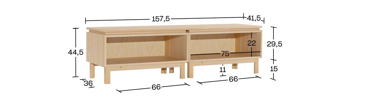 Móvel baixo de TV em madeira natural e ecológica, com tampo amplo e dois módulos abertos de arrumação para caixas ou cestos. Um móvel que alia funcionalidade e design, pensado para se adaptar a diferentes ambientes da casa. Fabricado em madeira ecológica certificada, permite organizar e arrumar de forma eficiente, mantendo um estilo fresco e intemporal.